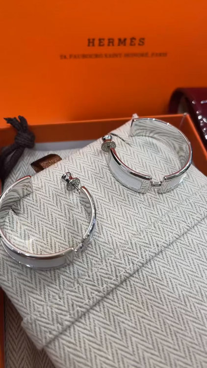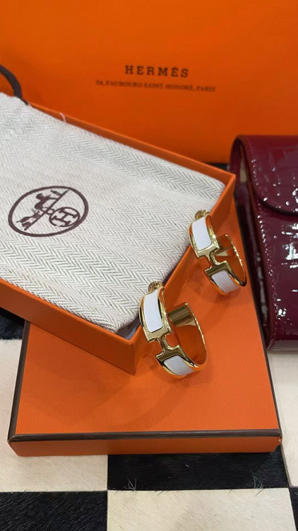 Hermès metal H letter white leather earrings-3714